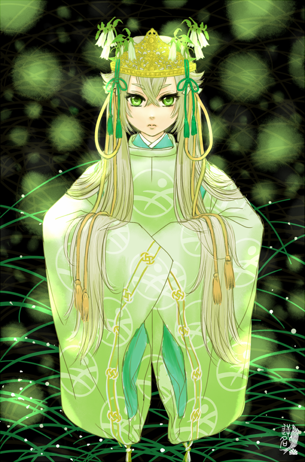 天冠 挿頭花…蛍袋(白)総角結び(松葉色)