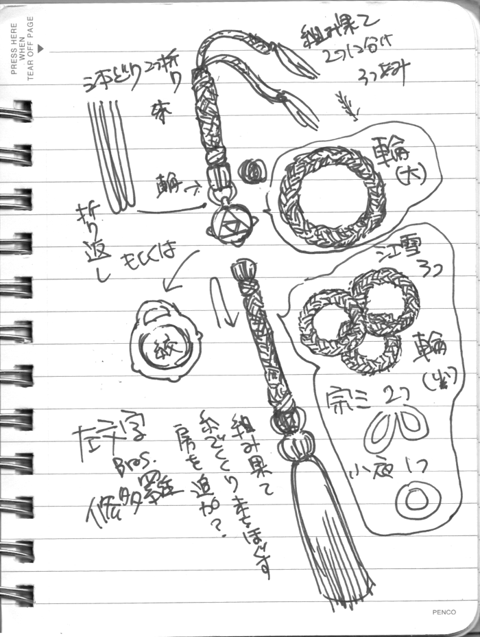 基本的に丸打組紐三本取り位の三つ編みで各パーツ作っているように見えるけど、