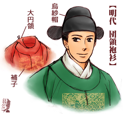 李氏朝鮮の朝服はちょうどこの頃の中国の服制を採用しているので、韓国の歴史ドラマで多く見かけるのはこのような団領(團領)袍衫である。