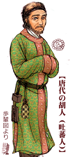 挿絵の吐蕃人は、閻立本(えんりっぽん/唐初の宮廷画家、?~673)の《歩輦図》を参考にした。官服は無地あるいは官制に即した文が入れられたが、元来の胡服は連珠文と呼ばれるパターンを特徴とする。