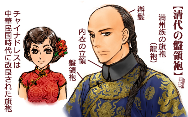 挿絵の旗袍は、襟ぐりの広い盤領袍の下に立襟のついた領衣を着るタイプである。領衣を着ない(立襟がなく、広い丸襟の上着だけを着る)スタイルは、女性に多かったようだ。唐代の盤領はまだ男装や一時的な流行だったが、清代になって本格的な盤領の女性服ができたことになる。衿を留める紐ボタン(盤扣)も、花を模した華やかな飾り結びで作られるようになった。