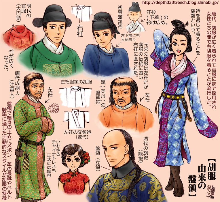 上に挙げた盤領袍の絵を再度ご覧頂くと、吐蕃と遼の袍は左衽、官服と男装の袍は右衽になっている。