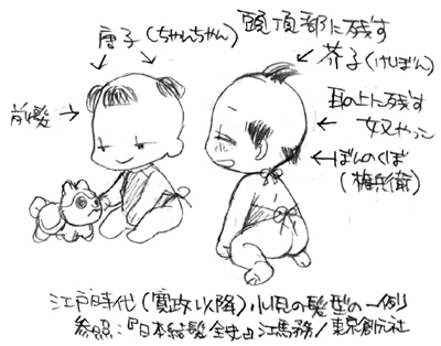 生後七日目に胎髪を除き、幼児期は短くしておくことは古代から続いていたが、剃刀の普及によって、鋏で短く剪る→剃刀で剃るようになった。