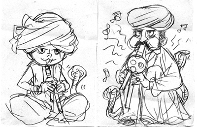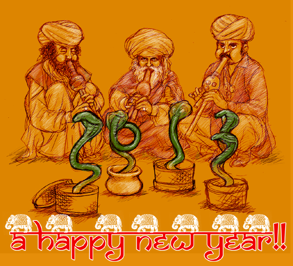 年賀状用に描いた蛇遣い。