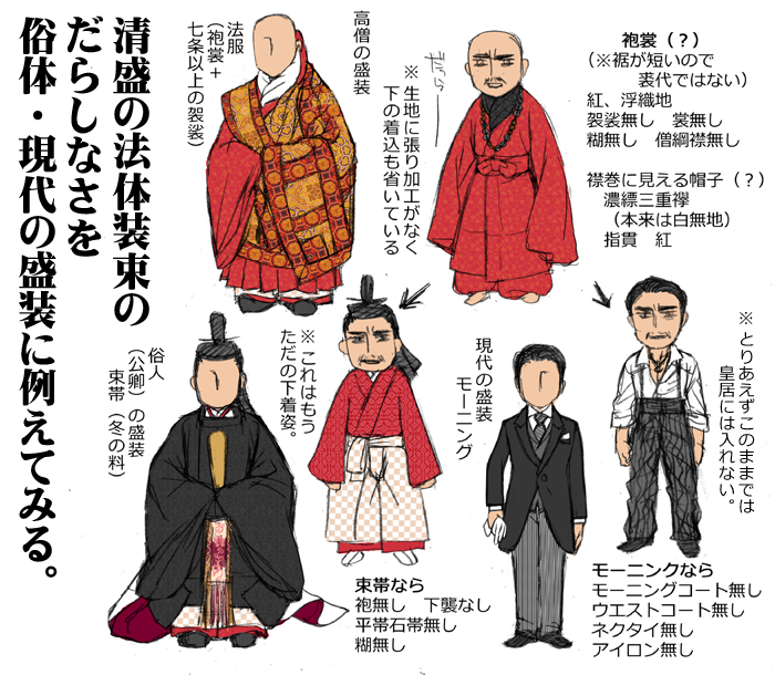 多分、赤素絹と、本来高僧の着るべき袍裳の中でも最も高位の色である赤の袍裳を混同してしまっているのだと思います。清盛がなんか作業に加わって腕まくりをしていましたが、あれは素絹でよくやることです。