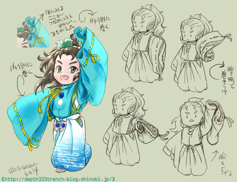 巻いたぶん袖の折り目がずれて、袖括りの露結びもちょっとずれるのとか、後ろ身頃が引き攣れてるのが萌えます。