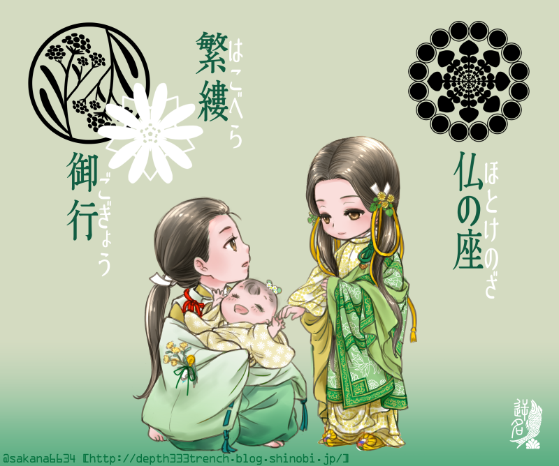 ほとけのざ(小鬼田平子)は法体の童子で、孝養太子を参考にして、奈良時代風に神さびた出で立ちの童子神形。紋は株を上から見たところで、古代袍なので連珠文風です。三つとも創作紋です。